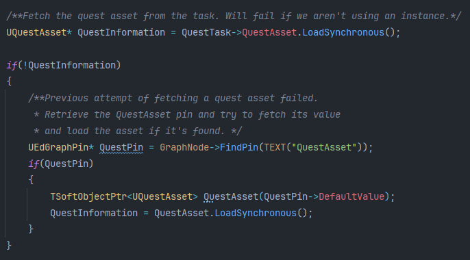 The decorator for the quest node contains an example of retrieving the value of a pin on the node to drive its visuals. Where as usually you'd enable `AllowInstance`and then have the decorator be driven by the instance. But since the quest node is simple enough that it doesn't require an instance, it's far simpler to just retrieve the value of the `QuestAsset`pin.